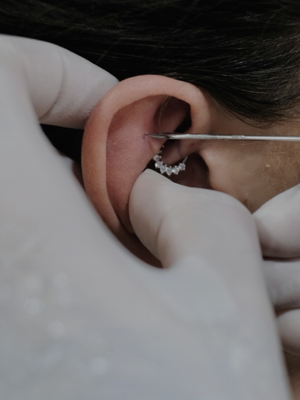 ✿⠀Диаметр иглы совпадает с украшением. После прокола в тупой конец иглы устанавливают украшение, а при выводе иглы, следом устанавливается застежка. Процесс настолько легкий, что клиент может этого даже не заметить. Украшение сразу перекрывает собой прокол, что позволяет сделать процедуру без крови.